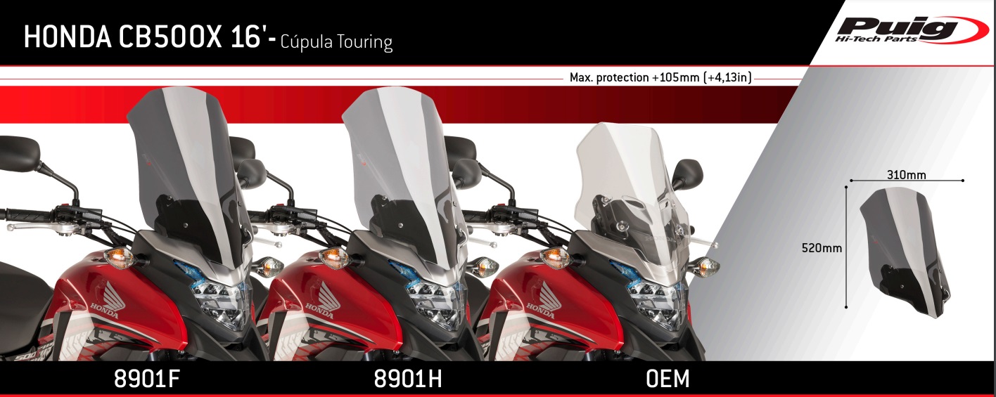 Bolha Touring, desenvolvidos pela Puig em Barcelona, são concebidos com o objetivo de proteger aerodinamicamente o piloto sem afetar o seu campo de visão. Além disso, essas bolhas combinam perfeitamente com o estilo de aventura e a estética dos modelos de trilha, graças à sua ampla gama de cores e tamanhos diferentes.