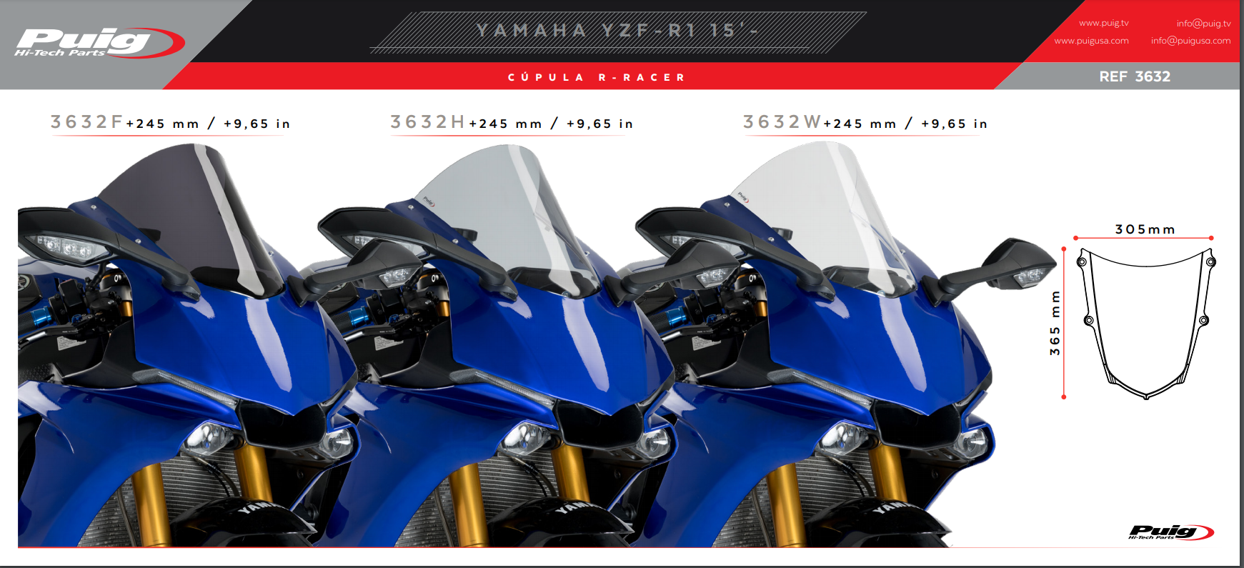 A linha de bolhas R-Racer é fruto da longa experiência de Puig em competições, trabalhando com as melhores equipes do MotoGP: Repsol Honda Team e também WorldSBK: Kawasaki Racing Team, para desenvolver as melhores bolhas para sua motocicleta esportiva.