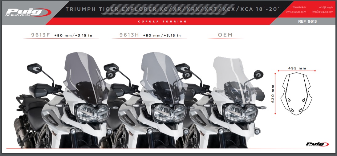 Os pára-brisas Touring, desenvolvidos pela Puig em Barcelona, são concebidos com o objetivo de proteger aerodinamicamente o piloto sem afetar o seu campo de visão. Além disso, essas telas combinam perfeitamente com o estilo e a estética de aventura dos modelos de trilha, graças à sua ampla gama de cores e tamanhos diferentes.